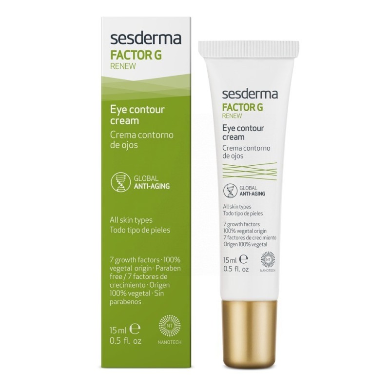 SESDERMA FACTOR G RENEW CONTORNO DE OJOS 15ML:- ANTIOXIDANTE.- IDIONEO PARA PIELES SNESIBLES Y REACTIVAS.CREMA ANTI EDAD PARA LA ZONA DEL CONTORNO DE OJOS, FORMULADA CON BIOTECNOLOGÍA. 7 FACTORES DE CRECIMIENTO DE ORIGEN VEGETAL, PARA REACTIVAR LOS MECANISMOS DE REGENERACIÓN DE LA PIEL Y UN COMPLEJO DE ACTIVOS QUE ACTÚAN SOBRE LAS OJERAS. FACTOR G RENEW MULTIPLICA POR 3 LA SÍNTESIS DE COLÁGENO Y ELASTINA, PARA LA REDUCCIÓN DE LAS ARRUGAS.
