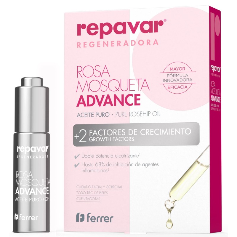 EL ACEITE PURO DE ROSA MOSQUETA DE REPAVAR TIENE UNA ALTA CAPACIDAD REGENERADORA. REPARACON PROFUNDIDAD LA PIEL, LA RECUPERA Y MEJORA LA ESTÉTICA DE CICATRICES POSTQUIRÚRGICAS, CICATRICES RESIDUALES, ÚLCERAS Y QUEMADURAS. APORTA ELASTICIDAD Y ATENÚA LAS ARRUGAS Y MANCHAS, EVITANDOLA PÉRDIDA DE FLEXIBILIDAD Y DEVOLVIENDO SU TERSURA. ESTE EXTRAORDINARIO ACEITE LO PUEDES UTILIZAR PARA EL CUERPO Y EL CUIDADO FACIAL.