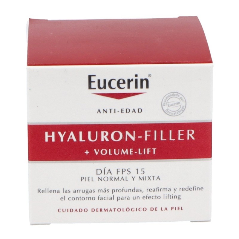 CREMA DE DÍA ANTIEDAD PARA PIELES NORMALES Y MIXTAS RELLENA LAS ARRUGAS MARCADAS Y REDEFINE LOS CONTORNOS FACIALES, CONSIGUIENDO UN EFECTO LIFTINGCREMA DE DÍA ANTIEDAD FPS15 PARA PIEL NORMAL Y MIXTA QUE RELLENA ARRUGAS Y REAFIRMA EL CONTORNO FACIAL PARA UN EFECTO LIFTINGUNA CREMA HIDRATANTE ANTIEDAD CON MAGNOLOL, OLIGOPÉPTIDOS Y ÁCIDO HIALURÓNICO. RELLENA LAS ARRUGAS MARCADAS Y REDEFINE LOS CONTORNOS FACIALES, CONSIGUIENDO UN EFECTO LIFTING.EUCERIN HYALURON-FILLER+VOLUME-LIFT DÍA PARA PIEL NORMAL Y MIXTA CONTIENE TRES INGREDIENTES ACTIVOS QUE ACTÚAN SOBRE CAPAS ESPECÍFICAS DE LA PIEL PARA ATACAR LOS FACTORES RESPONSABLES DE LA FLACIDEZ DE LA PIEL, LOS CONTORNOS FACIALES Y LA REDUCCIÓN DEL VOLUMEN DE LA PIEL.EL MAGNOLOL, DE ORIGEN NATURAL, AUMENTA EL TAMAÑO Y EL NÚMERO DE LAS CÉLULAS CON AUMENTO DE SU VOLUMEN.* A CONTINUACIÓN, LOS OLIGOPÉPTIDOS DERIVADOS DEL ANÍS FORTALECEN LA RED DE COLÁGENO Y MEJORAN LA RENOVACIÓN DE ÉSTE.* FINALMENTE, EL ÁCIDO HIALURÓNICO MEJORA LOS NIVELES DE RETENCIÓN DE LA HIDRATACIÓN PARA CONSEGUIR UNA PIEL MÁS RELLENA Y MENOS ARRUGAS.*ESTUDIOS IN VITROESTUDIOS CLÍNICOS Y DERMATOLÓGICOSLOS ESTUDIOS CLÍNICOS Y DERMATOLÓGICOS PRUEBAN LA EFICACIA Y LA COMPATIBILIDAD CON LA PIEL DE EUCERIN HYALURON-FILLER + VOLUME-LIFT DÍA FPS 15 PARA PIEL NORMAL Y MIXTA.PROPIEDADESFPS 15PROTECCIÓN UVA Y UVBEXCELENTE BASE DE MAQUILLAJENO COMEDOGÉNICOLIGERAMENTE PERFUMADO