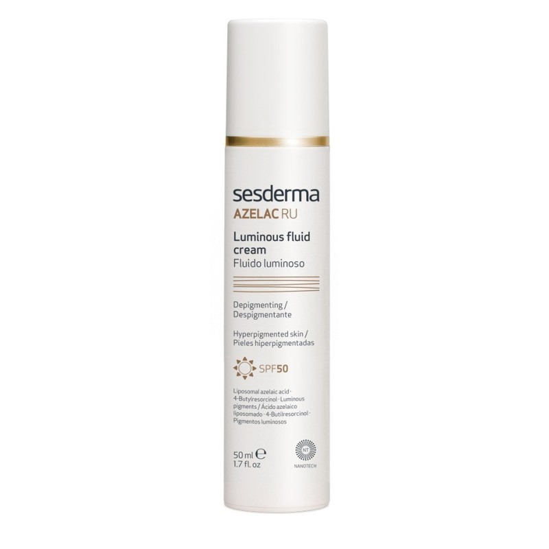 AZELAC RU FLUIDO LUMINOSO FACIAL CON ACTIVOS DESPIGMENTANTES LIPOSOMADOS QUE MEJORAN LA APARIENCIA DE LAS MANCHAS Y HOMOGENEIZAN EL TONO DE LA PIEL.CON SPF 50, CONTIENE FILTROS FÍSICOS Y QUÍMICOS QUE PROTEGEN DE LOS DAÑOS UV DEL SOL.TRIPLE ACCIÓN DESPIGMENTANTE:ACLARA: BLOQUEA Y REDUCE LA PRODUCCIÓN DE MELANINA DE FORMA EFICAZ.REDUCE: EVITA LA DISPERSIÓN DE LA MELANINA Y ELIMINA SU EXCESO.PREVIENE: FRENA LA APARICIÓN DE LAS MANCHAS.EL RESULTADO ES UNA PIEL SIN MANCHAS, CON UN TONO UNIFORME Y MÁS LUMINOSA GRACIAS A LOS PIGMENTOS LUMINOSOS.