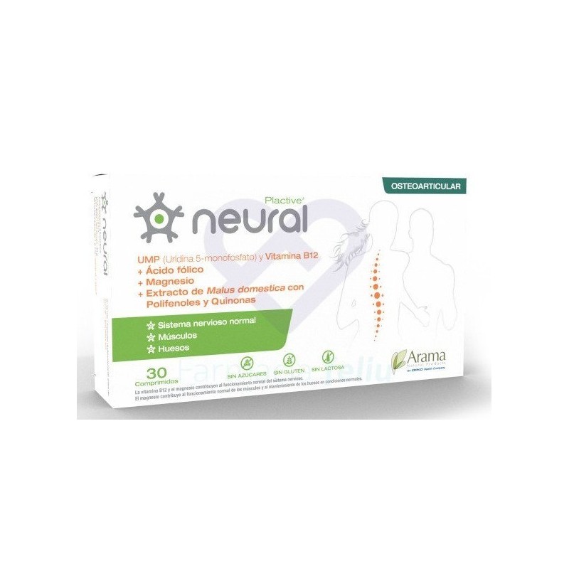 NEURAL ES UN COMPLEMENTO ALIMENTICIO QUE POR SU APORTE NUTRICIONAL A BASE DE URIDINA 5-MONOFOSFATO, QUINONAS, POLIFENOLES, MAGNESIO, L-METILFOLATO Y VITAMINA B12 SIRVE DE AYUDA COMO NUTRICIÓN DE SOPORTE EN SITUACIONES QUE CURSAN CON NEUROPATÍAS PERIFÉRICAS POR COMPRESIÓN, PINZAMIENTO O IRRITACIÓN NERVIOSA.URIDINA 5-MONOFOSFATO:LA URIDINA ES UN NUCLEÓTIDO ESENCIAL EN LA SÍNTESIS DE LOS FOSFOLÍPIDOS DE LAS MEMBRANAS DE LAS CÉLULAS Y POR TANTO DE LAS MEMBRANAS DE LAS CÉLULAS QUE FORMAN PARTE DE LAS NEURONAS Y LAS CÉLULAS GLIALES QUE FORMAN LOS NERVIOS.QUINONAS (PIRROLOQUINOLINA QUINONA):OBTENIDA DE UN EXTRACTO DE MANZANA.L-METILFOLATO:ES LA FORMA ACTIVA DEL ÁCIDO FÓLICO (VITAMINA B9) CON ALTA BIODISPONIBILIDAD. NUESTRO CUERPO NO ES CAPAZ DE PRODUCIRLA POR LO QUE LA DEBEMOS OBTENER DE LA DIETA. ES ESENCIAL PARA LA SÍNTESIS DE NUCLEÓTIDOS COMO LA URIDINA, Y MÚLTIPLES PROCESOS METABÓLICOS.VITAMINA B12:CONTRIBUYE AL FUNCIONAMIENTO NORMAL DEL SISTEMA NERVIOSO. SU SUPLEMENTACIÓN AYUDA EN LA RESPUESTA NEUROSENSORIAL POR TANTO A LA FUNCIÓN MÓVIL Y SENSORIAL NORMAL.MAGNESIO:EL MAGNESIO CONTRIBUYE AL FUNCIONAMIENTO NORMAL DEL SISTEMA NERVIOSO. INDICACIÓNNEURAL APORTA LOS NUTRIENTES, COMO LA VITAMINA B12 Y EL MAGNESIO, QUE CONTRIBUYEN AL FUNCIONAMIENTO NORMAL DEL SISTEMA NERVIOSO.POR SU COMPOSICIÓN ES UN COMPLEMENTO ALIMENTICIO QUE PUEDE SERVIR DE AYUDA COMO SOPORTE NUTRICIONAL EN CASOS DE NEUROPATÍAS PERIFÉRICAS TALES COMO CIÁTICAS, LUMBALGIAS, CERVICALGIAS, RADICULOPATÍAS, SÍNDROME DEL TÚNEL CARPIANO, CUBITAL O TARSIANO, NEUROPATÍA DEL TRIGÉMINO.MODO USOTOMAR 1 O 2 COMPRIMIDOS AL DÍA.