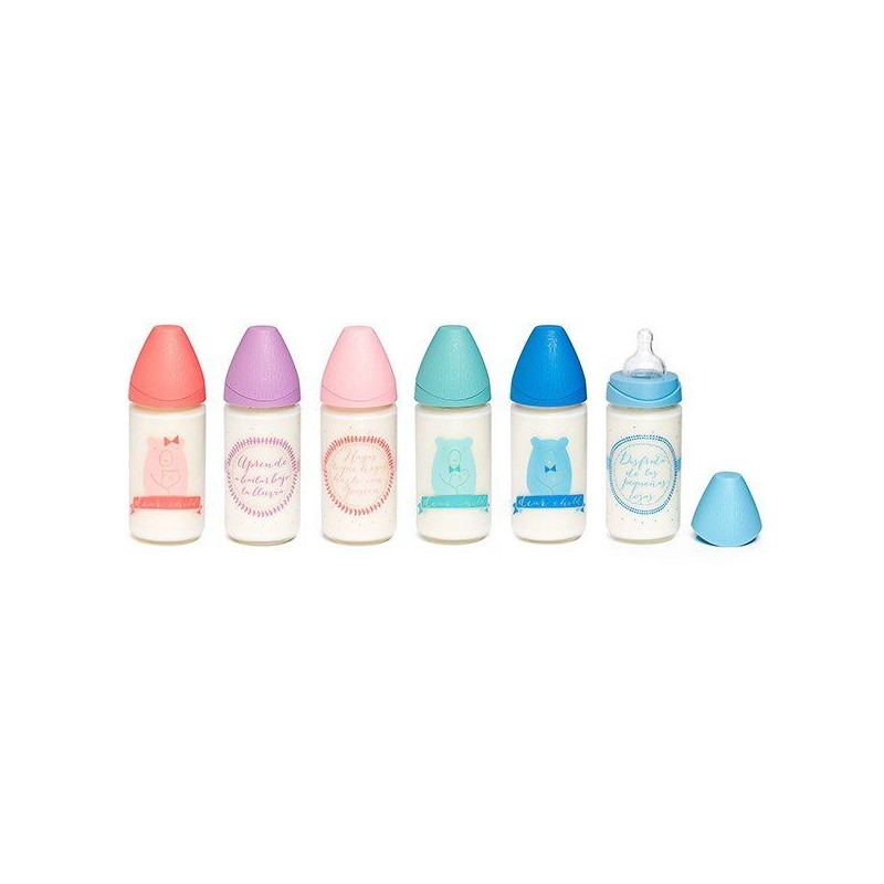 FABRICADO EN VIDRIO, NO ABSORBE OLORES, SABORES, NI COLORES DE LOS ALIMENTOS.TRANSPARENCIA, NATURALIDAD Y RESISTENCIA A LOS CAMBIOS BRUSCOS DE TEMPERATURA.SU GRAN DIÁMETRO FACILITA A LOS PADRES LA PREPARACIÓN Y LA LIMPIEZA DE LA TOMA, ADEMÁS DE POTENCIAR SU ESTABILIDAD, MIENTRAS QUE SU FORMA ERGONÓMICA PERMITE UNA MAYOR SUJECIÓN MÁS CÓMODA Y SEGURA.CON TETINA REDONDA CON VÁLVULAS ANTICÓLICO, QUE PERMITE ADAPTARSE AL RITMO DE SUCCIÓN DEL BEBÉ DURANTE LA TOMA, TAN SÓLO GIRANDO EL BIBERÓN.TETINA FABRICADA EN SILICONA MÉDICA, MATERIAL ALTAMENTE RESISTENTE E INDEFORMABLE QUE NO ALTERA SU COLOR NI OLOR.DISPONIBLE EN DIFERENTES DISEÑOS A JUEGO CON CHUPETES Y BROCHES PINZA DE LA COLECCIÓN.CON FUNDA DE SILICONA QUE PARA PROTEGER EL CRISTAL FRENTE A RASGUÑOS. TIENE UNA ABERTURA LATERAL QUE PERMITE VER LA CANTIDAD DE LÍQUIDO.