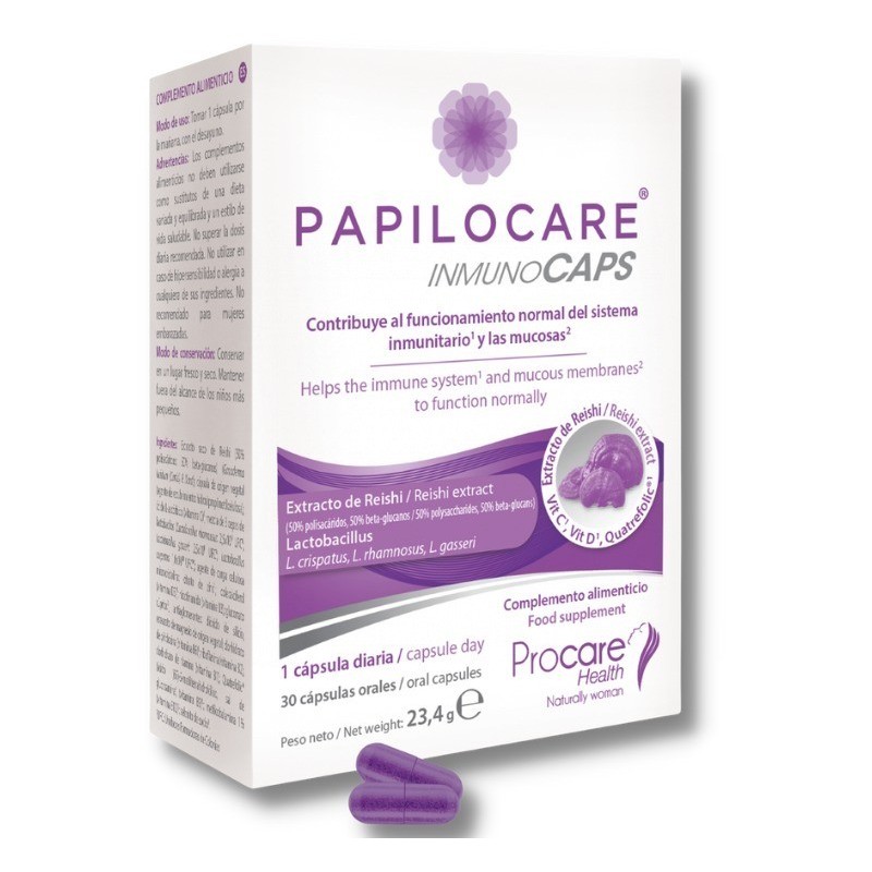 PAPILOCARE® INMUNOCAPS ES UN COMPLEMENTO ALIMENTICIO A BASE DE EXTRACTO DE REISHI QUE CONTRIBUYE AL FUNCIONAMIENTO NORMAL DEL SISTEMA INMUNITARIO Y LAS MUCOSAS.GRACIAS A SUS COMPONENTES, PAPILOCARE® INMUNOCAPS AYUDA A NORMALIZAR LA MICROBIOTA VAGINAL Y A FORTALECER LAS DEFENSAS NATURALES DEL ORGANISMO. ¿CUÁNDO DEBO UTILIZARLO?SU USO ES ACONSEJABLE DE FORMA INDIVIDUAL O BIEN JUNTO A PAPILOCARE® GEL VAGINAL O PAPILOCARE® GEL GENITAL EXTERNO.PAPILOCARE® INMUNOCAPS RESULTA ADECUADO EN PACIENTES CON VPH SIN LESIONES PARA ACELERAR EL PROCESO DE ELIMINACIÓN DEL VIRUS, O BIEN EN HOMBRES CUYA PAREJA ES POSITIVA PARA VPH.COMO COADYUVANTE DEBE UTILIZARSE JUNTO A PAPILOCARE® GEL VAGINAL EN CASO DE TENER MAS DE 40 AÑOS, SUFRIR INMUNODEPRESIÓN, ALGÚN TIPO DE VPH DE ALTO RIESGO O VIRUS PERSISTENTE O HABER SIDO SOMETIDA A UNA CIRUGÍA DE ESCISIÓN.TAMBIÉN ES RECOMENDABLE EN HOMBRES Y MUJERES CON CONDILOMAS GENITALES QUE USEN PAPILOCARE® GEL GENITAL EXTERNO. ¿CÓMO UTILIZARLO?SU USO TIENE UNA DURACIÓN DE UN MÍNIMO DE TRES MESES, QUE PUEDE ALARGARSE SEGÚN LA INDICACIÓN DEL ESPECIALISTA MÉDICO.LA DOSIS DIARIA RECOMENDADA ES DE UNA CÁPSULA DE PAPILOCARE® INMUNOCAPS AL DÍA, POR LA MAÑANA CON EL DESAYUNO.