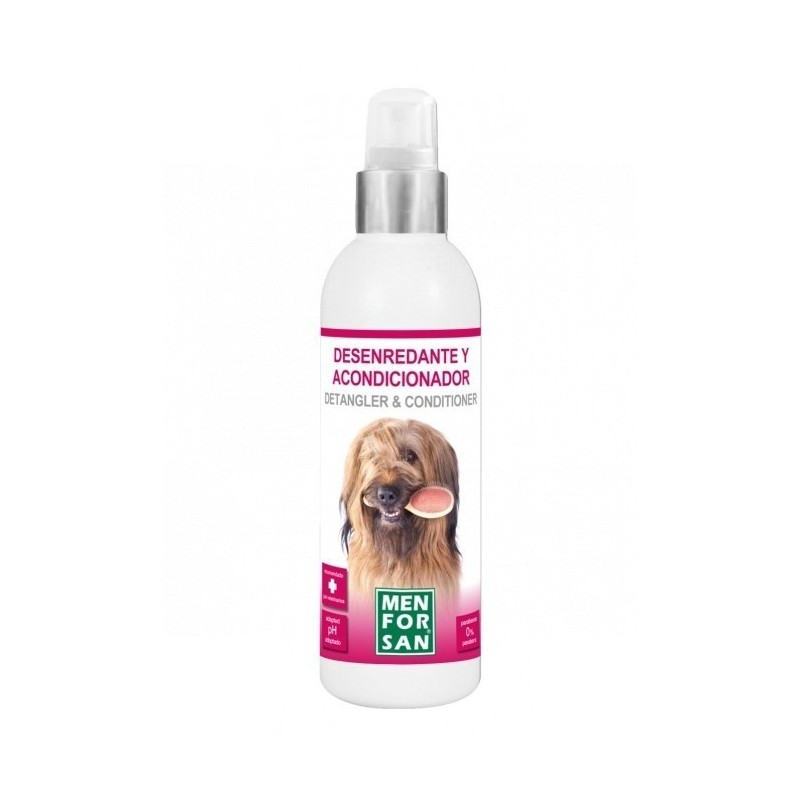 MENFORSAN SPRAY DESENREDANTE Y ACONDICIONADOR ES UN POTENTE ACONDICIONADOR Y DESENREDANTE PARA PERROS QUE PERMITE QUE LE PUEDA PEINAR A SU PERRO SIN TIRONES. ESTE PRODUCTO MANTIENE UN PELO SEDOSO Y CON VOLUMEN A SU MASCOTA. DESHACE TODO TIPO DE NUDOS Y ELIMINA LA ELECTRICIDAD ESTÁTICA QUE TENGA SU PERRO.MODO DE EMPLEOSE PUEDE UTILIZAR EN SECO Y HÚMEDO. APLICAR SOBRE EL PELO A UNA DISTANCIA DE UNOS 20CM. PH NEUTRO.