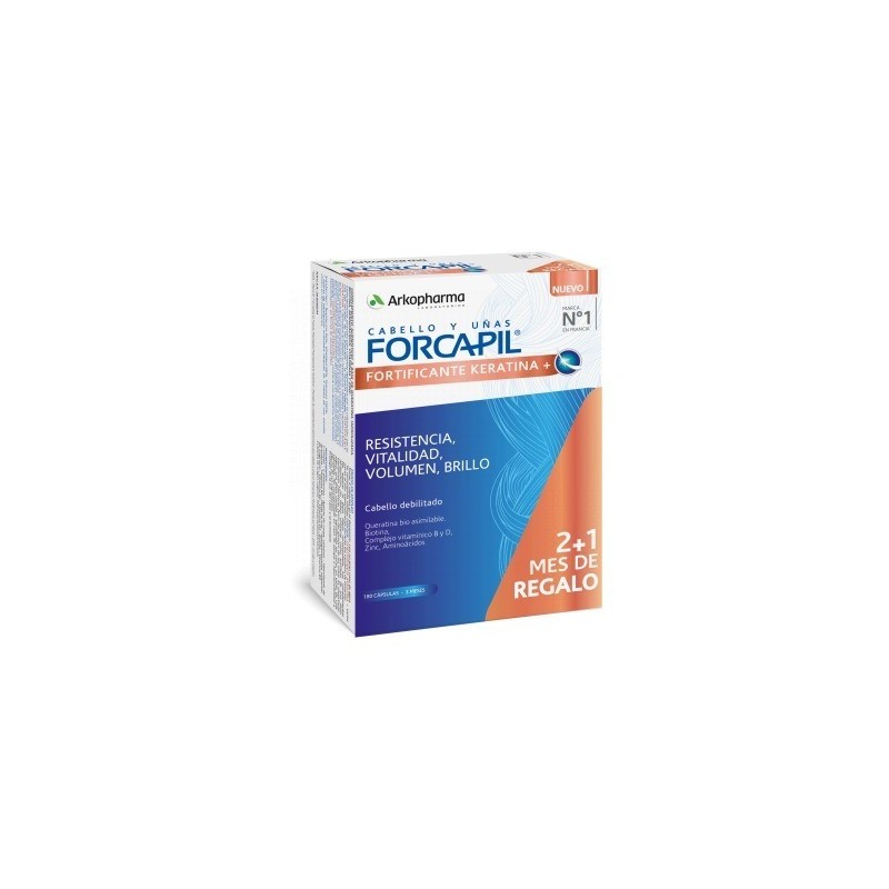 LA FÓRMULA FORCAPIL® FORTIFICANTE KERATINA + ESTÁ ESPECIALMENTE PENSADA PARA CABELLOS DEBILITADOS POR LA COLORACIÓN, EL USO DEL SECADOR O DE LAS PLANCHAS DEVOLVIENDO AL CABELLO SU RESISTENCIA, VITALIDAD, VOLUMEN Y BRILLO. COMPLEMENTO ALIMENTICIO A BASE DE QUERATINA HIDROLIZADA, BIOTINA, AMINOÁCIDOS, VITAMINAS Y ZINC. EL ZINC CONTRIBUYE AL MANTENIMIENTO DE LAS UÑAS Y EL CABELLO EN CONDICIONES NORMALES Y PARTICIPA DE LA SÍNTESIS DE LAS PROTEÍNAS, COMO LA QUERATINA. LA BIOTINA CONTRIBUYE AL MANTENIMIENTO DEL CABELLO EN CONDICIONES NORMALES. FORCAPIL® FORTIFICANTE KERATINA + CONTIENE UNA QUERATINA HIDROLIZADA BIOASIMILABLE, EN FORMA DE AMINOÁCIDOS. MODO DE EMPLEOTOMAR 2 CÁPSULAS EN EL DESAYUNO CON UN GRAN VASO DE AGUA. SE RECOMIENDA UTILIZAR FORCAPIL® FORTIFICANTE KERATINA + VARIAS VECES AL AÑO, ESPECIALMENTE DURANTE LOS CAMBIOS DE ESTACIÓN.APTO EN EMBARAZO Y LACTANCIA. CONSULTE A SU PROFESIONAL SANITARIO.NO SUPERAR LA DOSIS DIARIA RECOMENDADA.LOS COMPLEMENTOS ALIMENTICIOS NO DEBEN UTILIZARSE COMO SUSTITUTO DE UNA DIETA EQUILIBRADA.MANTENER FUERA DEL ALCANCE DE LOS NIÑOS.ES IMPORTANTE SEGUIR UNA DIETA VARIADA Y EQUILIBRADA ASÍ COMO UN ESTILO DE VIDA SALUDABLE.NO RECOMENDADO EN CASO DE ALERGIA O HIPERSENSIBILIDAD A ALGUNO DE SUS INGREDIENTES.PROTEGER DEL CALOR, DE LA LUZ Y LA HUMEDAD.INGREDIENTESL-CISTINA - L - METIONINA - AGENTE DE CARGA: CELULOSA - HIDROLIZADO DE QUERATINA - VITAMINA B5 - ÓXIDO DE ZINC - ANTIAGLOMERANTE: ESTEARATO DE MAGNESIO - VITAMINA B6 - VITAMINA D3  - BIOTINA - VITAMINA B9. CUBIERTA DE ORIGEN VEGETAL: HIDROXIPROPILMETILCELULOSA.