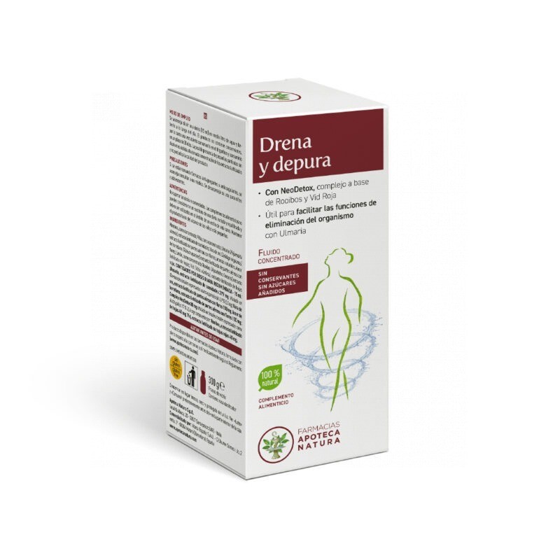 CON NEODETOX, COMPLEJO A BASE DE ROOIBOS Y VID ROJA.ÚTIL PARA FACILITAR LAS FUNCIONES DE ELIMINACIÓN DEL ORGANISMO CON ULMARIA.LA INNOVADORA FORMULACIÓN DE DRENA Y DEPURA FLUIDO CONCENTRADO SE CARACTERIZA POR LA PRESENCIA DE LOS EXTRACTOS DE VARA DE ORO, AMOR DE HORTELANO Y ULMARIA. ESTA ÚLTIMA PLANTA ES ÚTIL PARA FACILITAR LAS FUNCIONES DE ELIMINACIÓN DEL ORGANISMO.ADEMÁS, EL COMPLEJO NEODETOX CONTIENE EXTRACTOS DE ROOIBOS Y VID ROJA, QUE ES UNA FUENTE NATURAL DE ANTIOXIDANTES.LA FORMULACIÓN DEL PRODUCTO SE COMPLETA CON EL ZUMO DE PIÑA QUE, CON SU CARACTERÍSTICO SABOR, CONTRIBUYE A HACER QUE RESULTE ESPECIALMENTE AGRADABLE DE TOMAR.MODO DE EMPLEOSE ACONSEJA DILUIR UNA DOSIS (15 ML) EN MEDIO LITRO DE AGUA Y BEBERLO A LO LARGO DEL DÍA.EL PRODUCTO NO CONTIENE CONSERVANTES, POR LO TANTO UNA VEZ ABIERTO CONSERVARLO EN EL FRIGORÍFICO Y CONSUMIRLO EN UN PLAZO DE 30 DÍAS. LA POSIBLE PRESENCIA DE PEQUEÑAS PARTÍCULAS SIN DISOLVER ES DEBIDA A LA ELEVADA CONCENTRACIÓN DE LOS EXTRACTOS LIOFILIZADOS Y NO PERJUDICA LA CALIDAD DEL PRODUCTO.AGITAR ANTES DE USAR.PRECAUCIONESSI SE ESTÁN TOMANDO FÁRMACOS ANTIAGREGANTES O ANTICOAGULANTES, SE ACONSEJA CONSULTAR A UN MÉDICO. SE DESACONSEJA SU USO PARA NIÑOS Y ADOLESCENTES.NO SUPERAR LAS DOSIS RECOMENDADAS. LOS COMPLEMENTOS ALIMENTICIOS NO PUEDEN CONSIDERARSE UN SUSTITUTO DE UNA DIETA VARIADA Y EQUILIBRADA Y DEBEN SER UTILIZADOS EN EL ÁMBITO DE UN ESTILO DE VIDA SANO. MANTENER EL PRODUCTO FUERA DEL ALCANCE DE LOS NIÑOS MÁS PEQUEÑOS.INGREDIENTESMANZANA, ZUMO CONCENTRADO, PIÑA, ZUMO CONCENTRADO, ULMARIA (FILIPENDULA ULMARIA), EXTRACTO LIOFILIZADO DE SUMIDADES, VARA DE ORO (SOLIDAGO VIRGAUREA), EXTRACTO LIOFILIZADO DE PARTES AÉREAS CON FLORES, AROMAS NATURALES, AMOR DE HORTELANO (GALIUM APARINE), EXTRACTO LIOFILIZADO DE PARTES AÉREAS CON FLORES, LIMÓN, ZUMO CONCENTRADO, ROOIBOS (ASPALATHUS LINEARIS), EXTRACTO LIOFILIZADO DE HOJAS, VID (VITIS VINIFERA), EXTRACTO LIOFILIZADO DE HOJAS ROJAS.