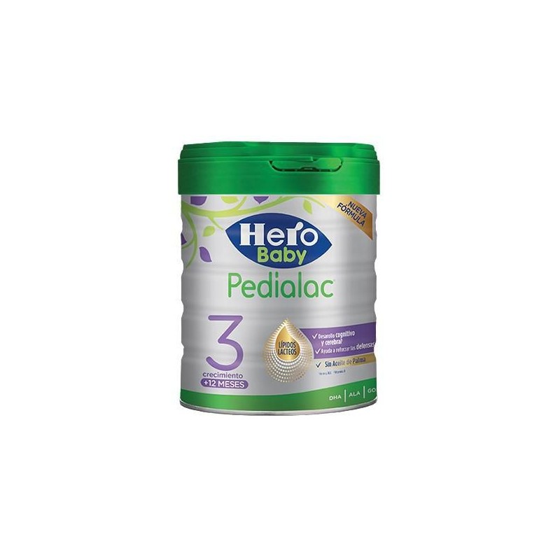 HERO BABY PEDIALAC 3 ES UNA LECHE DE CRECIMIENTO QUE CONTIENE UNA INNOVADORA FÓRMULA COMPUESTA POR ÁCIDOS GRASOS DHA Y ARA.LA LECHE INFANTIL HERO BABY PEDIALAC PUEDE AYUDAR A DESARROLLAR LAS CAPACIDADES DE TU BEBÉ GRACIAS A SU COMBINACIÓN EXCLUSIVA DE LÍPIDOS LÁCTEOS Y OTROS NUTRIENTES ESENCIALES: INGREDIENTES LECHE DESNATADA, LACTOSA, MALTODEXTRINA, ACEITES VEGETALES (GIRASOL, NABINA, PALMA Y COCO), GRASA LÁCTEA, GALACTO-OLIGOSACÁRIDOS (GOS), CONCENTRADO DE PROTEÍNAS SÉRICAS, MINERALES (FOSFATO CÁLCICO, CITRATO POTÁSICO, HIDRÓXIDO CÁLCICO, CARBONATO CÁLCICO, CITRATO CÁLCICO, SULFATO MAGNÉSICO, CITRATO SÓDICO, CLORURO POTÁSICO, SULFATO FERROSO, SULFATO DE ZINC, SULFATO DE COBRE, SULFATO DE MANGANESO, YODURO POTÁSICO, SELENITO SÓDICO), ACEITE DE PESCADO, EMULGENTE (LECITINA DE SOJA), VITAMINAS (C, E, NIACINA, ÁCIDO PANTOTÉNICO, B1, B6, A, B2, ÁCIDO FÓLICO, K, BIOTINA, D3 Y B12), CLORURO DE COLINA, INOSITOL Y L-CARNITINA. ANÁLISIS MEDIO POR 100 ML: PROTEÍNAS: 1,3 G HIDRATOS DE CARBONO: 8,2 G - AZÚCARES: 5,5 G LÍPIDOS: 2,6 G - SATURADOS: 1,0 G - MONOINSATURADOS: 1,1 G - POLIINSATURADOS: 0,4 G - ÁCIDO LINOLEICO: 380 MG - ÁCIDO ALPHA-LINOLÉNICO: 50 MG - DHA: 7,9 MG FIBRA ALIMENTARIA: 0,2 G GOS: 0,2 G VITAMINAS, MINERALES Y AMINOACIDOS VITAMINAS: VITAMINA A (RETINOL): 61 MCG VITAMINA D3 (COLECALCIFEROL): 1,5 MCG VITAMINA E (TOCOFEROL): 0,82 MG VITAMINA C (ÁCIDO ASCÓRBICO): 11 MG VITAMINA B1 (TIAMINA): 65 MCG VITAMINA B2 (RIBOFLAVINA): 120 MCG VITAMINA B3 (NIACINA): 0,43 MG VITAMINA B6 (PIRIDOXINA): 43 MCG VITAMINA B9 (ÁCIDO FÓLICO): 7,3 MCG VITAMINA B12 (CIANOCOBALAMINA): 0,19 MCG BIOTINA: 1,9 MCG ÁCIDO PANTOTÉNICO: 390 MCG VITAMINA K: 4,4 MCG COLINA: 8,6 MG MINERALES: SODIO: 24 MG, CALCIO: 108 MG FÓSFORO: 60 MG HIERRO: 1,0 MG POTASIO: 83 MG MAGNESIO: 6,65 MG COBRE: 56 MCG CINC: 0,67 MG MANGANESO: 13 MCG IODO: 9,3 MCG CLORO: 50,5 MG SELENIO: 2,7 MCG FLÚOR: INOSITOL: 3,3 MG L-CARNITINA: 1,3 MG TAURINA: 5,3 MG ENERGÍA 62 KCAL / 260 KJ MODO DE EMPLEO LAVARSE Y SECAR BIEN LAS MANOS ANTES DE PREPARAR EL BIBERÓN. ESTERILIZAR LOS BIBERONES, TETINAS Y DEMÁS UTENSILIOS A UTILIZAR EN LA PREPARACIÓN. PONER EN EL BIBERÓN LA CANTIDAD DE AGUA HERVIDA INDICADA EN LA TABLA DE DOSIFICACIÓN Y DEJAR ENFRIAR HASTA LOS 40ºC. AÑADIR EN EL BIBERÓN LOS CORRESPONDIENTES CACITOS UTILIZANDO EL ENRASADOR DEL BOTE. UTILIZAR SOLAMENTE EL CACITO DOSIFICADOR ADJUNTO PARA AÑADIR LA MEDIDA JUSTA DE LECHE. CERRAR EL BIBERÓN, AGITAR HASTA SU COMPLETA DISOLUCIÓN Y COMPROBAR LA TEMPERATURA ANTES DE DÁRSELO AL BEBÉ. PRECAUCIONES Y ADVERTENCIAS PREPARADO LÁCTEO PARA BEBÉS DE MÁS DE 12 AÑOS Y NO DEBE UTILIZARSE COMO SUSTITUTIVO DE LA LECHE MATERNA DURANTE LOS PRIMEROS 6 MESES DE VIDA. HA SIDO FORMULADO PARA QUE SU BEBÉ LA TOME COMO PARTE DE UNA DIETA DIVERSIFICADA. CONSERVACIÓN Y CADUCIDAD CONSERVAR EN UN LUGAR FRESCO Y SECO. UNA VEZ ABIERTO EL BOTE, CONSUMIR EN EL PLAZO MÁXIMO DE UN MES. ENVASADO EN ATMÓSFERA PROTECTORA. SE RECOMIENDA PREPARAR LE BIBERÓN ANTES DE CADA TOMA Y TIRAR LA LECHE SOBRANTE. USO EN PACIENTES CON INTOLERANCIA ALIMENTARIA ESTE PRODUCTO LO PUEDE TOMAR UNA PERSONA CELIACA Y/O ALÉRGICA/INTOLERANTE AL HUEVO. ESTE PRODUCTO NO LO PUEDE TOMAR UNA PERSONA ALÉRGICA/INTOLERANTE A LA LECHE. CONTIENE UNA FUENTE DE SOJA Y FENILALANINA, Y PESCADO.