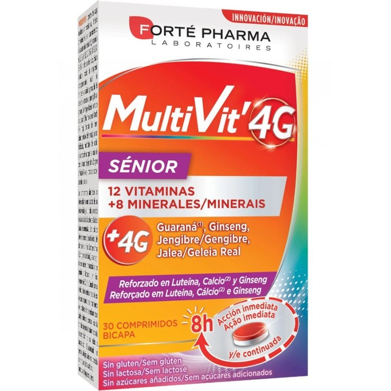 SU FÓRMULA COMPLETA ASOCIA:- 12 VITAMINAS, CON DOSIS DEL 100% MÍNIMO DE LOS VALORES NUTRICIONALES RECOMENDADOS,- 8 MINERALES, ESENCIALES PARA EL BUEN FUNCIONAMIENTO DE NUESTRO ORGANISMO,- EL COMPLEJO 4G: GINSENG, GUARANÁ, JALEA REAL Y JENGIBRE.MULTIVIT 4G SÉNIOR ESTÁ REFORZADA EN LUTEÍNA, CALCIO Y GINSENG QUE ACTÚAN EN SINERGIA.ALEGACIONES:EL GUARANÁ AYUDA A REDUCIR LA FATIGA MENTAL Y CONTRIBUYE AL ESTADO DE VIGILIA.EL CALCIO Y LA VITAMINA D CONTRIBUYEN AL FUNCIONAMIENTO DE LOS HUESOS EN CONDICIONES NORMALES.EL ZINC Y LA VITAMINA A CONTRIBUYEN AL MANTENIMENTO DE LA VISIÓN EN CONDICIONES NORMALES.SIN GLUTEN. SIN LACTOSA. SIN HUEVO. SIN SOJA. SIN FENILALANINA. SIN AZÚCARES AÑADIDOS. SIN YODO.MODO DE EMPLEOTOMAR 1 COMPRIMIDO AL DÍA CON UN VASO DE AGUA (200 ML), DURANTE 30 DÍAS, PREFERENTEMENTE POR LA MAÑANA. SE RECOMIENDA LA UTILIZACIÓN DE 1 A 2 MESES, DESDE LOS PRIMEROS SIGNOS DE FATIGA.INGREDIENTES (MG EQUIVALENTES EN PLANTAS): AGENTES DE CARGA (HIDROXIPROPILMETILCELULOSA, CELULOSA MICROCRISTALINA, CARBOXIMETILCELULOSA DE SODIO RETICULADO), VITAMINAS (C, E, B3, A, B5, B12, D3, B6, B2, B1, B9, B8), CARBONATO DE CALCIO, SALES CÁLCICAS DE ÁCIDO ORTOFOSFÓRICO, ÓXIDO DE MAGNESIO, ANTIAGLOMERANTES (SALES DE MAGNESIO DE ÁCIDOS GRASOS, DIÓXIDO DE SILICIO), EXTRACTO DE GINSENG (PANAX GINSENG CA MEYER) (100), COLORANTE (ÓXIDOS DE HIERRO), LUTEÍNA, EXTRACTO DE GUARANÁ (PAULLINIA CUPANA KUNTH) (75), FUMARATO DE HIERRO, JALEA REAL LIOFILIZADA (20), MOLIBDATO DE SODIO, GLUCONATO DE MANGANESO, ÓXIDO DE ZINC, EXTRACTO DE JENGIBRE (ZINGIBER OFFICINALE ROSCOE) (20), CITRATO DE COBRE, SELENITO DE SODIO.