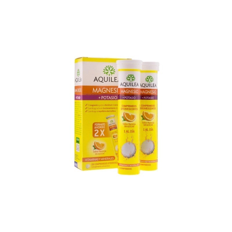 LA CARENCIA DE MAGNESIO PUEDE MANIFESTARSE CON FATIGA, DEBILIDAD MUSCULAR, CALAMBRES... LA INGESTA DE MAGNESIO ES MUY IMPORTANTE EN PERSONAS QUE PRACTICAN DEPORTE PARA LA RECUPERACIÓN DEL TONO MUSCULAR. ADEMÁS, EL INCREMENTO EN LA SUDORACIÓN SUPONE UNA MAYOR PÉRDIDA DE MINERALES TALES COMO EL POTASIO.POR ELLO, AQUILEA MAGNESIO + POTASIO ES LA COMBINACIÓN IDEAL DE MAGNESIO Y POTASIO QUE TE AYUDA A RESTAURAR LOS MINERALES PERDIDOS Y TE APORTA ENERGÍA Y BIENESTAR EN CADA TOMA PARA RECUPERAR EL TONO MUSCULAR DE FORMA NATURAL.ADEMÁS, CON MAGNESIO DE ALTA ABSORCIÓN GRACIAS A SUS TRES FUENTES DE MAGNESIO.INGREDIENTESÁCIDO CÍTRICO (ACIDULANTE), BISGLINATO DE MAGNESIO, BICARBONATO DE POTASIO, CARBONATO DE MAGNESIO, ÓXIDO DE MAGNESIO, CARBONATO DE SODIO (CORRECTOR DE LA ACIDEZ), AROMA DE NARANJA, ROJO DE REMOLOCHA (COLORANTE), SUCRALOSA (EDULCORANTE), RIBOFLAVINA (COLORANTE). VITAMINAS, MINERALES Y AMINOACIDOS POR COMPRIMIDO: MAGNESIO: 375 MG POTASIO: 375 MG.LOS COMPLEMENTOS ALIMENTICIOS NO DEBEN UTILIZARSE COMO SUSTITUTOS DE UNA ALIMENTACIÓN VARIADA Y EQUILIBRADA Y UN MODO DE VIDA SANO. NO SUPERAR LA DOSIS DIARIA EXPRESAMENTE RECOMENDADA. MANTENER FUERA DEL ALCANCE DE LOS NIÑOS MÁS PEQUEÑOS.