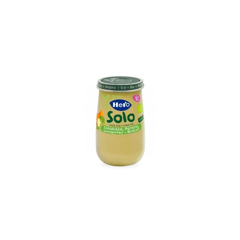 LOS TARRITOS DE DE CALABAZA, PATATA, GUISANTES Y BRÓCOLI DE HERO BABY SOLO, ESTÁN ELABORADOS CON LA MEJOR SELECCIÓN DE INGREDIENTES ECOLÓGICOS PARA ASEGURARLE A TU BEBÉ UNA ALIMENTACIÓN NATURAL Y NUTRITIVA A PARTIR DE LOS 6 MESES. NUESTRO SECRETO, PREPARARLO COMO TÚ LO HARÍAS EN CASA, DE MANERA 100% NATURAL.INGREDIENTESVEGETALES* (71%) (CALABAZA* (20%), PATATA* (18%), GUISANTES* (15%), BRÓCOLI (11%), CEBOLLA (7%)), AGUA DE COCCIÓN Y ACEITE DE OLIVA VIRGEN EXTRA* (2,3%). *PROCEDENTES DE AGRICULTURA ECOLÓGICA. SIN GLUTEN.