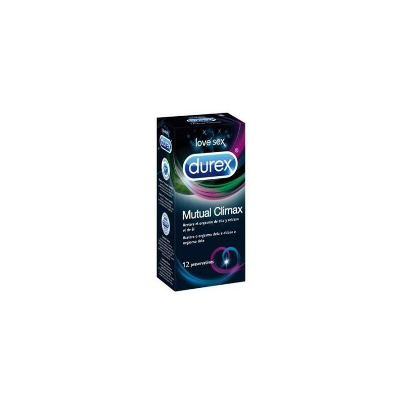 PROPIEDADESDUREX MUTUAL CLIMAX SON PRESERVATIVOS DISEÑADOS PARA ACELERAR EL CLÍMAX DE ELLA Y RETRASAR EL DE ÉL.DUREX MUTUAL CLIMAX SON PRESERVATIVOS DISEÑADOS CON PUNTOS Y ESTRÍAS PARA ACELERAR EL CLÍMAX DE ELLA Y CON LUBRICANTE PERFORMA QUE CONTIENE UN 5% DE BENZOCAÍNA PARA RETRASAR EL DE ÉL.CARACTERÍSTICASPRESERVATIVO CON PUNTOS Y ESTRÍAS PARA ACELERAR EL CLÍMAX DE ELLA Y CON LUBRICANTE PERFORMA QUE CONTIENE UN 5% DE BENZOCAÍNA PARA RETRASAR EL DE ÉLFORMA ANATÓMICA EASY-ON, CON DEPÓSITOPRESERVATIVOS TRANSPARENTESANCHURA NOMINAL: 56MMLA FORMA ESPECIAL EN QUE SE FABRICA DUREX MUTUAL CLIMAX HACE QUE HUELAN MEJOR PARA QUE NO HAYAN INCÓMODAS DISTRACCIONES, POR LO QUE PODRÁS RELAJARTE Y DISFRUTAR.ADVERTENCIASEL LUBRICANTE DE DUREX MUTUAL CLIMAX PUEDE CAUSAR ERUPCIONES, IRRITACIÓN, ARDOR O PICOR. EVÍTESE EL CONTACTO CON LOS OJOS. LÍMPIATE DESPUÉS DE SU USO. SI SIENTES IRRITACIÓN, DISCONTINÚA SU USO Y SI NO EXPERIMENTAS MEJORÍA, CONSULTA A UN MÉDICO. NO UTILICES ESTOS PRESERVATIVOS SI TÚ O TU PAREJA TENÉIS LA PIEL INFLAMADA O AGRIETADA. SI TÚ O TU PAREJA EXPERIMENTÁIS DIFICULTAD RESPIRATORIA O SE OS PONEN LOS LABIOS AZULES MIENTRAS UTILIZÁIS ESTOS PRESERVATIVOS, DEJAD DE USARLO INMEDIATAMENTE Y LLAMAD AL MÉDICO. LA EYACULACIÓN PRECOZ ES UN PROBLEMA COMÚN, QUE PUEDE SER DEBIDA A CAUSAS QUE REQUIEREN ATENCIÓN MÉDICA. SI ESTOS PRESERVATIVOS NO TE AYUDAN, CONSULTA CON TU MÉDICO.INDICACIONESLEE EL FOLLETO QUE CONTIENE EL INTERIOR DE ESTE ESTUCHE CUIDADOSAMENTE, EN ESPECIAL SI UTILIZAS LOS PRESERVATIVOS PARA SEXO ORAL O ANAL.UTILIZA EL PRESERVATIVO UNA SOLA VEZ.NINGÚN MÉTODO ANTICONCEPTIVO PUEDE PROPORCIONAR 100% DE PROTECCIÓN FRENTE AL EMBARAZO, VIH (SIDA) U OTRAS ENFERMEDADES DE TRANSMISIÓN SEXUAL. DERMATOLÓGICAMENTE TESTADOS.UTILIZAR LOS LUBRICANTES DUREX PLAY CON LOS PRESERVATIVOS PUEDE DAR MÁS INTENSIDAD A TUS RELACIONES SEXUALES. TODOS LOS LUBRICANTES DUREX PLAY SON SEGUROS, A DIFERENCIA DE LOS LUBRICANTES DE BASE OLEOSA QUE PUEDEN DAÑAR LOS PRESERVATIVOS.PARA UNA SEGURIDAD ÓPTIMA EL PRODUCTO DEBE ALMACENARSE EN UN SITIO FRESCO Y SECO, LEJOS DE LA LUZ DIRECTA DEL SOL.100% ELECTRÓNICAMENTE TESTADOS.