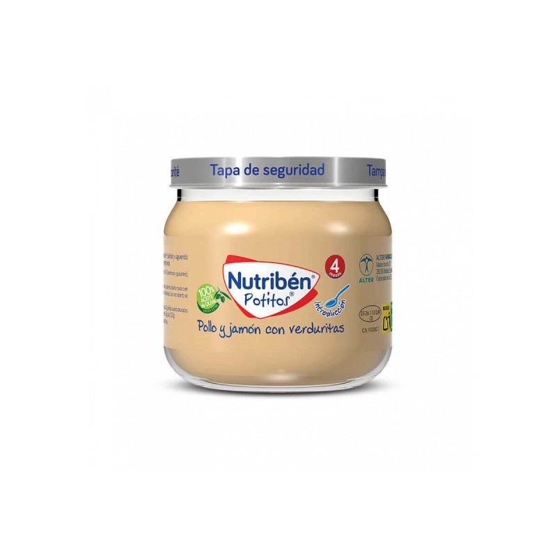 INFORMACIÓN DEL PRODUCTO / REGULACIÓN NUTRIBÉN POTITOS® POLLO Y JAMÓN CON VERDURAS ES UN ALIMENTO INFANTIL DESTINADO A NIÑOS A PARTIR DEL 4º MES DE EDAD. FABRICADO POR ALTER FARMACIA S. A., MATEO INURRIA 30, 28036 MADRID (ESPAÑA). NUTRIBÉN POTITOS® POLLO Y JAMÓN CON VERDURAS CUMPLE CON LOS ESTÁNDARES DE COMPOSICIÓN ESTABLECIDOS POR LA FAO (ONU) EN EL CODEX ALIMENTARIUS PARA PREPARADOS ALIMENTICIOS COMPLEMENTARIOS PARA LACTANTES DE MÁS EDAD Y NIÑOS PEQUEÑOS, Y ES PRODUCIDO CON LOS INGREDIENTES Y NUTRIENTES ABAJO INDICADOS. EL PRODUCTO CUMPLE CON EL REGLAMENTO 609/2013 RELATIVO A LOS ALIMENTOS DESTINADOS A LACTANTES Y NIÑOS DE CORTA EDAD, LOS ALIMENTOS PARA USOS MÉDICOS ESPECIALES Y LOS SUSTITUTIVOS DE LA DIETA COMPLETA PARA EL CONTROL DE PESO. NUTRIBÉN POTITOS® POLLO Y JAMÓN CON VERDURAS CUMPLE TODA LA LEGISLACIÓN EUROPEA RELATIVA A PESTICIDAS, RESIDUOS, SUSTANCIAS TÓXICAS Y PERJUDICIALES. LISTADO DE INGREDIENTES EN ORDEN DECRECIENTE AGUA DE COCCIÓN POLLO Y JAMÓN 15% VERDURAS 14% (ZANAHORIAS Y GUISANTES) ARROZ 6% ALMIDÓN DE MAÍZ ACEITE DE OLIVA VIRGEN EXTRA 0,5 % CEBOLLA ZUMO DE LIMÓNINFORMACIÓN NUTRICIONAL ANÁLISIS MEDIO POR 100 G VALOR ENERGÉTICO 306 KJ 73 KCAL GRASAS 2,1 G DE LAS CUALES SATURADAS 0,6 G HIDRATOS DE CARBONO 9,6 G DE LOS CUALES AZÚCARES 1,1 G FIBRA ALIMENTARIA 0,5 G PROTEÍNAS 3,6 G SAL 0,07 G GARANTÍA DE CALIDAD TODO EL PROCESO PRODUCTIVO ESTÁ SOMETIDO A LAS “PRÁCTICAS HIGIÉNICAS PARA LA ELABORACIÓN DE ALIMENTOS INFANTILES Y DE NIÑOS DE CORTA EDAD” DE LA COMISIÓN DEL CODEX ALIMENTARIO DE LA FAO/WHO CAC/RCP 21-1-1979. ADEMÁS, EL PROCESO PRODUCTIVO ESTÁ CERTIFICADO POR LAS NORMAS ISO 9001E ISO 22.000. MÉTODO DE ELABORACIÓN DEL POTITO EL PROCESO SE DIVIDE EN LAS SIGUIENTES ETAPAS: - PESADO Y MEZCLA DE MATERIAS PRIMAS - COCCIÓN 105ºC DURANTE 15 MINUTOS - LLENADO DE TARROS. - ESTERILIZACIÓN (122ºC, 55 MINUTOS) - ENFRIADO - ALMACENAMIENTO Y CUARENTENA. - ANÁLISIS FÍSICO - QUÍMICOS Y MICROBIOLÓGICOS - ETIQUETADO Y EMBALAJE VIDA MEDIA DEL PRODUCTO LA CALIDAD DE ESTE POTITO SE GARANTIZA DURANTE LOS 3 AÑOS POSTERIORES DESDE LA FECHA DE PRODUCCIÓN SIEMPRE Y CUANDO EL ALMACENAJE SEA CORRECTO.CONSERVACIÓN EL ENVASE SE DEBE GUARDAR EN LUGAR FRESCO Y SECO. UNA VEZ ABIERTO EL ENVASE, SE CONSERVA 24 HORAS EN EL FRIGORÍFICO. INSTRUCCIONES DE PREPARACIÓN ABRIR EL POTITO Y CALENTARLO AL BAÑO MARÍA O AL MICROONDAS SIN TAPA, REMOVIENDO POSTERIORMENTE CON UNA CUCHARA PARA CONSEGUIR UNA TEMPERATURA UNIFORME EN TODO EL PRODUCTO. COMPROBAR LA TEMPERATURA ANTES DE DÁRSELA AL NIÑO NO AÑADIR SAL O AZÚCAR.