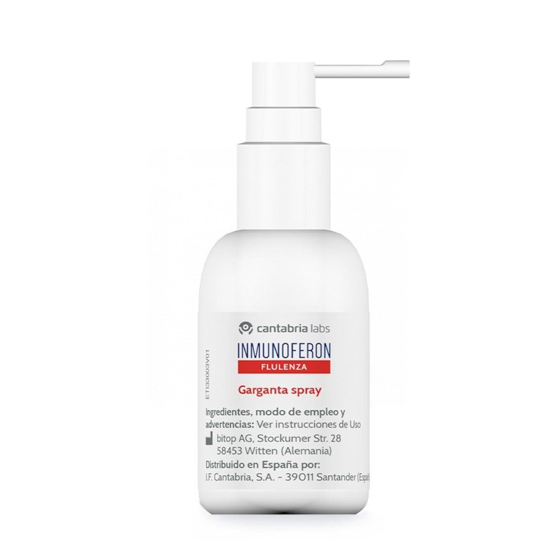 TRATAMIENTO DE LA SEQUEDAD E IRRITACIÓN DE LOS EPITELIOS DE BOCA Y GARGANTA.REDUCE LOS SÍNTOMAS DE FARINGITIS AGUDA Y/O LARINGITIS TALES COMO EL DOLOR DE GARGANTA, RONQUERA, TOS Y DOLOR AL TRAGARCONTRIBUYE A REDUCIR LA INFLAMACIÓN DE LAS MUCOSAS DE BOCA Y GARGANTA.COMPOSICIÓNECTOIN®SAL MARINATAMPÓN FOSFATOACEITE DE MENTAXILITOLAGUAPRECAUCIONESLOS NIÑOS MENORES DE 2 AÑOS NO DEBEN USAR INMUNOFERON FLULENZA GARGANTA SPRAYINMUNOFERON FLULENZA GARGANTA SPRAY NO DEBE USARSE EN CASO DE HIPERSENSIBILIDAD A ECTOIN® O A ALGUNO DE SUS INGREDIENTESEN CASO DE REACCIÓN ALÉRGICA SUSPENDER INMEDIATAMENTE EL USO DE INMUNOFERON FLULENZA GARGANTA SPRAYPARA GARANTIZAR UN USO HIGIÉNICO SEGURO CADA ENVASE DEBE SER USADO POR UNA ÚNICA PERSONANO USAR MÁS DE 3 MESES UNA VEZ ABIERTO EL ENVASEMANTENER INMUNOFERON FLULENZA GARGANTA SPRAY FUERA DEL ALCANCE DE LOS NIÑOSNO USAR SI EL DISPOSITIVO ESTÁ DAÑADO O ABIERTO