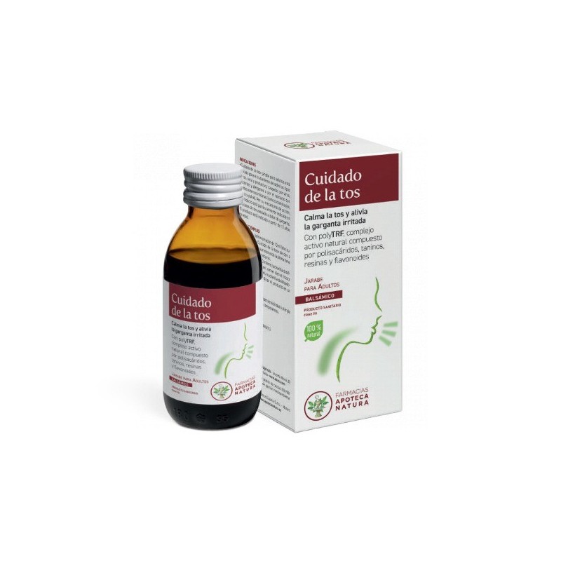 CALMA LA TOS Y ALIVIA LA GARGANTA IRRITADA.CON POLYTRF, COMPLEJO VEGETAL COMPUESTO POR POLISACÁRIDOS, TANINOS, RESINAS Y FLAVONOIDES.«CUIDADO DE LA TOS» JARABE PARA ADULTOS ACTÚA GRACIAS AL COMPLEJO VEGETAL POLYTRF, COMPUESTO POR POLISACÁRIDOS, TANINOS, RESINAS Y FLAVONOIDES, CON DOBLE ACCIÓN:ACCIÓN PROTECTORA: PROTEGE LA MUCOSA INFLAMADA Y REDUCE SU HIPERSENSIBILIDAD A LOS ESTÍMULOS TUSÍGENOS, CALMANDO LA TOS. ADEMÁS, EN CASO DE DOLOR DE GARGANTA, LA ACCIÓN PROTECTORA Y LA ANTIOXIDANTE REDUCEN EL DOLOR.ACCIÓN HIDRATANTE Y LUBRICANTE: FAVORECE LA HIDRATACIÓN, FLUIDIFICANDO EL MOCO Y REDUCE EL ROZAMIENTO QUE CAUSA LA TOS PERSISTENTE. TAMBIÉN HIDRATA LA MUCOSA Y REDUCE EL ESCOZOR Y LA SENSIBILIDAD AL DEGLUTIR.ADEMÁS, LOS TANINOS Y LAS RESINAS CREAN UN AMBIENTE DESFAVORABLE PARA EL CRECIMIENTO DE LAS BACTERIAS, MIENTRAS QUE LA MIEL FAVORECE LAS ACCIONES PRINCIPALES DEL PRODUCTO.MODO DE EMPLEOSE ACONSEJA LA ADMINISTRACIÓN DE 10 ML (DOS CUCHARADITAS) DE «CUIDADO DE LA TOS» DE DOS A CUATRO VECES AL DÍA, SUMINISTRANDO LA ÚLTIMA TOMA ANTES DEL DESCANSO NOCTURNO.ADVERTENCIASNO UTILIZAR EN CASO DE HIPERSENSIBILIDAD O ALERGIA INDIVIDUAL A UNO O MÁS COMPONENTES. SE RECOMIENDA CONSULTAR AL MÉDICO EN CASO DE QUE LOS SÍNTOMAS NO MEJOREN. CONSERVAR A TEMPERATURA AMBIENTE, ALEJADO DE FUENTES DE CALOR Y PROTEGIDO DE LA LUZ. MANTENER EL PRODUCTO FUERA DEL ALCANCE DE LOS NIÑOS. LA FECHA DE CADUCIDAD SE REFIERE AL PRODUCTO SIN ABRIR Y CORRECTAMENTE CONSERVADO.INGREDIENTESCOMPONENTES FUNCIONALES: POLYTRF, COMPLEJO VEGETAL COMPUESTO POR POLISACÁRIDOS, TANINOS, FLAVONOIDES Y RESINAS DE LLANTÉN, AGRIMONIA Y MIRRA, MIEL. OTROS COMPONENTES: AZÚCAR DE CAÑA, AGUA, LIMÓN, ZUMO CONCENTRADO, GOMA ARÁBIGA, ACEITE ESENCIAL DE EUCALIPTO, ACEITE ESENCIAL DE PINO NEGRO, ACEITE ESENCIAL DE MIRTO, ACEITE ESENCIAL DE MENTA PIPERITA, AROMA NATURAL, GOMA XANTANA.FRASCO DE VIDRIO DE 180 GCONTIENE CUCHARILLA DOSIFICADORA CE 0546.
