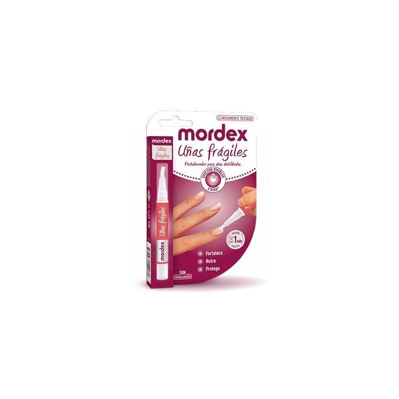 MORDEX UÑAS FRÁGILES, EL PRIMER TRATAMIENTO PARA LAS UÑAS FRÁGILES, QUEBRADIZAS Y DÉBILES. SU FÓRMULA A BASE DE QUERATINA, GLICERINA Y ESCUALENO, PERMITE FORTALECER Y PROTEGER LAS UÑAS*.ADEMÁS, NO IRRITA LA PIEL YA QUE NO CONTIENE FORMALDEHÍDO, POR LO QUE NO DAÑA LA CUTÍCULA Y OFRECE UN PERFUME AGRADABLE.FÁCIL DE APLICAR GRACIAS A SU PINCEL DE PRECISIÓN, MORDEX UÑAS FRÁGILES TAMBIÉN SE SECA RÁPIDAMENTE.A PARTIR DEL 3º DÍA DE APLICACIÓN, LAS UÑAS ESTÁN MÁS NUTRIDAS Y PROTEGIDAS, FORTALECIDAS E HIDRATADAS, MEJORA EL ASPECTO ESTÉTICO*.AL FINAL DEL TRATAMIENTO DE 14 DÍAS, CONSIGUE UNAS UÑAS CON:-PLACA UNGUEAL MÁS DURA, MÁS FUERTE Y MENOS QUEBRADIZAS–MENOS ROTURAS–REPARADAS Y MÁS LISAS-MÁS BLANQUECINAMODO DE EMPLEO:EN EL PRIMER USO DEL PRODUCTO, GIRE EL EXTREMO ROTATIVO VARIAS VECES PARA HACER SALIR EL PRODUCTO. APLICAR DESPUÉS SOBRE LAS UÑAS LIMPIAS Y SECAS. PARA POSTERIORES APLICACIONES, GIRAR EL EXTREMO ROTATIVO TAN SOLO UNA VEZ. APLICAR 2 VECES AL DÍA. TRATAMIENTO ACONSEJADO DE 14 DÍAS. SI FUERA NECESARIO, EL PRODUCTO PUEDE RETIRARSE CON AGUA. SECAR EL PINCEL DESPUÉS DE SU USO SI FUERA NECESARIO.PRECAUCIONES DE USO:NO SOBREPASAR LAS 2 APLICACIONES AL DÍA.CERRAR BIEN TRAS CADA APLICACIÓN HASTA ESCUCHAR UN CLIC.NO UTILIZAR EN CASO DE ALERGIA A ALGUNO DE SUS COMPONENTES.USO EXTERNO.NO INGERIR.NO APLICAR SOBRE PIEL DAÑADA O IRRITADA, SOBRE UNA HERIDA O SOBRE MUCOSAS.EVITAR EL CONTACTO CON LOS OJOS.EN CASO DE CONTACTO CON LOS OJOS, ENJUAGAR INMEDIATAMENTE CON AGUA.NO FUMAR DURANTE LA APLICACIÓN DEL PRODUCTO NI ANTES DE QUE SE HAYA SECADO COMPLETAMENTE.MANTENER LEJOS DEL ALCANCE DE LOS NIÑOS.MANTENER ALEJADO DE FUENTES CALOR O LLAMA ABIERTA.NO ABRIR EL EXTREMO ROTATIVO.NO ENJUAGAR EL PINCEL CON EL AGUA.A PARTIR DE 15 AÑOS.COMPOSICIÓN:ALCOHOL DENAT , AQUA , HYDROXYETHYL ACRYLATE/SODIUM ACRYLOYLDIMETHYL TAURATE COPOLYMER , GLYCERI, SQUALANE , PARFUM , POLYSORBATE 60 , HYDROLIZED KERATIN , SORBITAN ISOSTEARATE , POTASSIUM SORBATE , SODIUM BENZOATE , PHENOXYETHANOL.