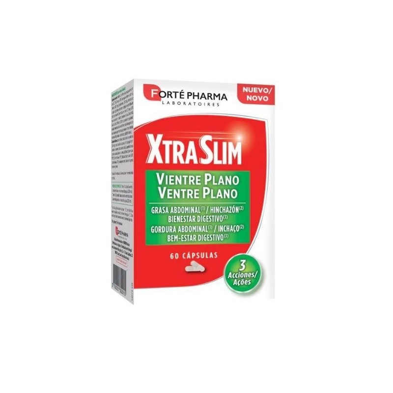 XTRASLIM VIENTRE PLANO, UNA FÓRMULA TRIPLE ACCIÓN GRACIAS A LA COLA, EL MATE, EL COMINO Y EL CALCIO.LA COLA AYUDA A QUEMAR LAS GRASAS(1). EL COMINO FACILITA LA DIGESTIÓN Y ALIVIA LA SENSACIÓN DE HINCHAZÓN Y GAS(2). EL CALCIO CONTRIBUYE AL FUNCIONAMIENTO NORMAL DE ENZIMAS DIGESTIVAS (3). LA FÓRMULA SE COMPLETA CON INULINA DE ACHICORIA, AMINOÁCIDOS (L-LEUCINA, L-GLUTAMINA), VITAMINAS B6 Y B8 Y 2 CEPAS MICROBIÓTICAS MICROENCAPSULADAS (BIFIDOBACTERIUM BREVE BR03 Y BIFIDOBACTERIUM LACTIS BS01).PARA OBTENER RESULTADOS ÓPTIMOS, ES ACONSEJABLE COMBINAR XTRASLIM VIENTRE PLANO CON MEDIDAS DIETÉTICAS Y LA PRÁCTICA DE ACTIVIDAD FÍSICA REGULAR.ALEGACIONES:(1) LA COLA AYUDA A QUEMAR LAS GRASAS.(2) EL COMINO FACILITA LA DIGESTIÓN Y ALIVIA LA SENSACIÓN DE HINCHAZÓN Y GAS.(3) EL CALCIO CONTRIBUYE AL FUNCIONAMIENTO NORMAL DE ENZIMAS DIGESTIVAS.SIN GLUTEN, SIN LACTOSA. SIN AZÚCARES AÑADIDOS.